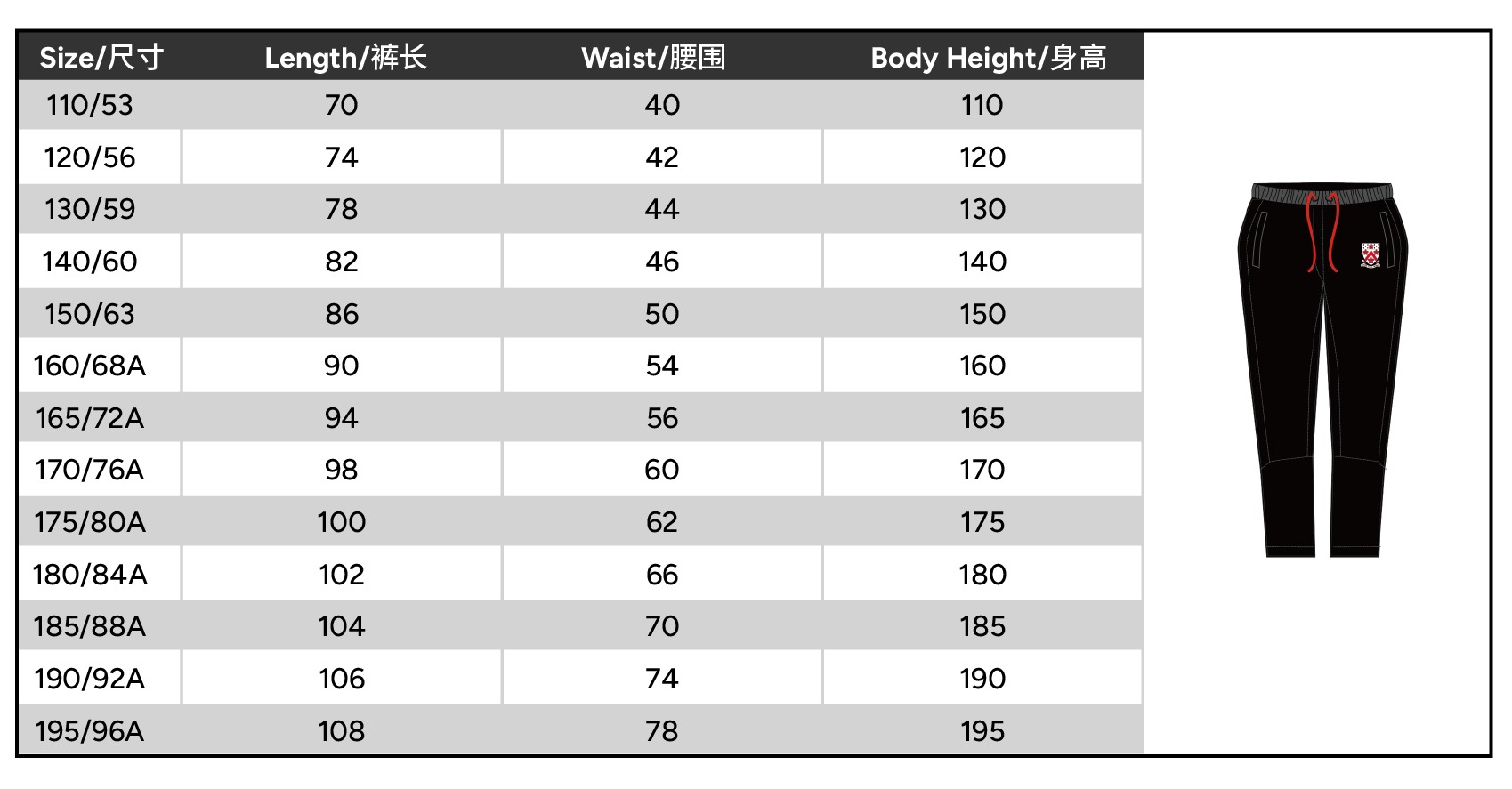Size 110 or 120 or 130 or 140 or 150 or 160 or 165 or 170 or 175 or 180 or 185 or 190 or 195
