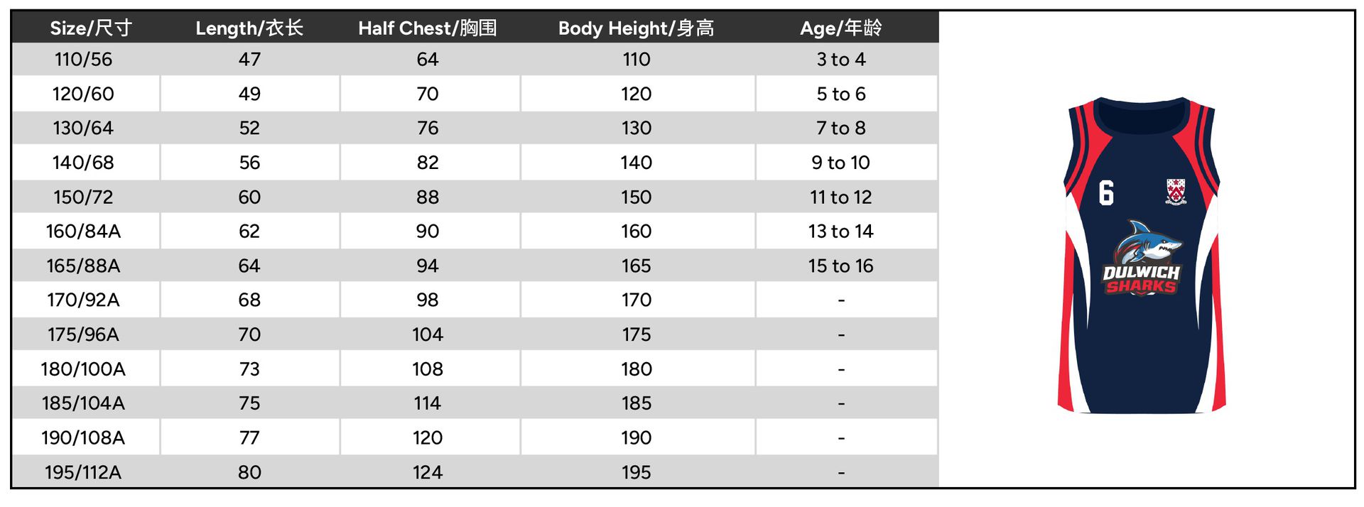 Size 110 or 120 or 130 or 140 or 150 or 160 or 165 or 170 or 175 or 180 or 185 or 190 or 195
